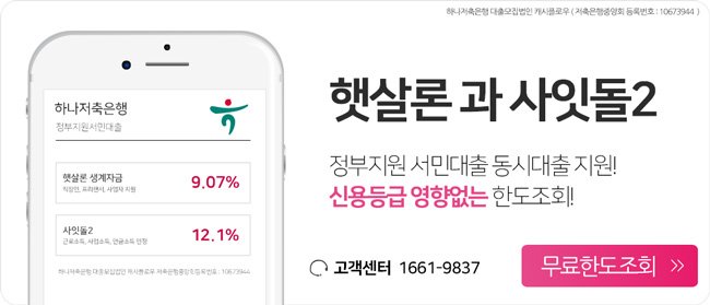 신용등급 영향없는 햇살론 무료한도조회 문의는 하나저축은행 공식모집법인 캐시플로우 홈페이지( www.hanaok.com ) 대표전화번호(☎1661-9837 ),, 온라인상담(카카오톡:하나프렌즈) 을 통해 보다 햇살론에 관한 자세한 내용을 확인해볼 수 있다.