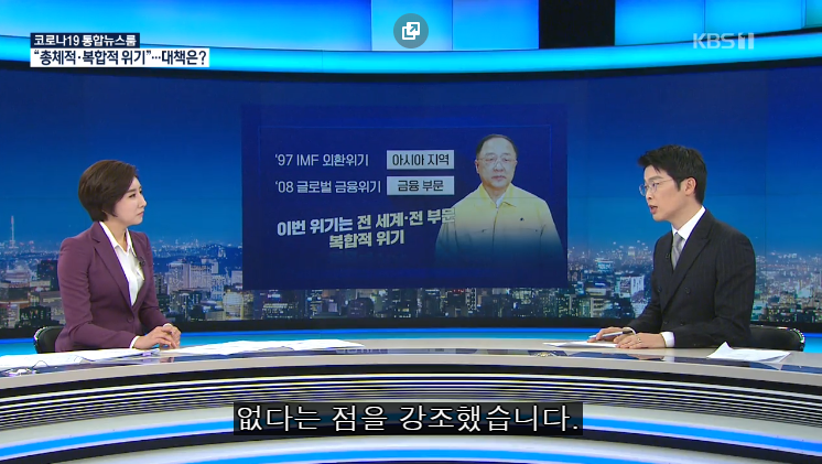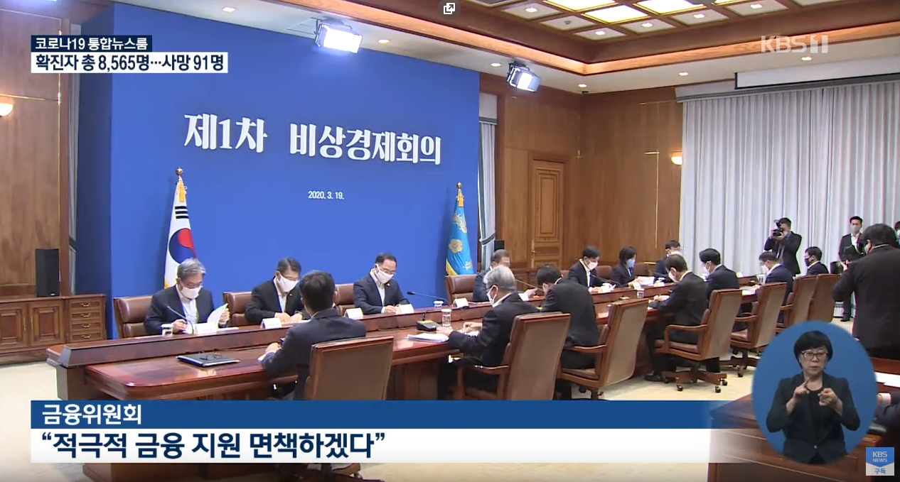 3월 19일이 첫번째 비상경제회의였고, 중소기업, 자영업자, 소상공인이 코로나로 인한 경기 불황으로 단기적으로 망하지 않고 버틸수 있도록 모든 금융지원을 동원하겠다라는게 핵심입니다.