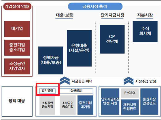 단기자금시장에 충격 확산을 우려하여 대출과 보증에 관련된 만기연장에 중점을 두고 추진하겠습니다.